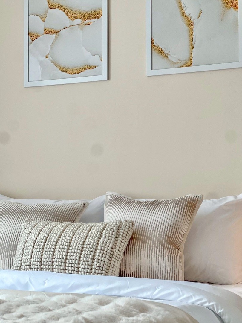 - Water heater, sofa, bedside table, bedside table with lamp Dining table with cutlery and plates